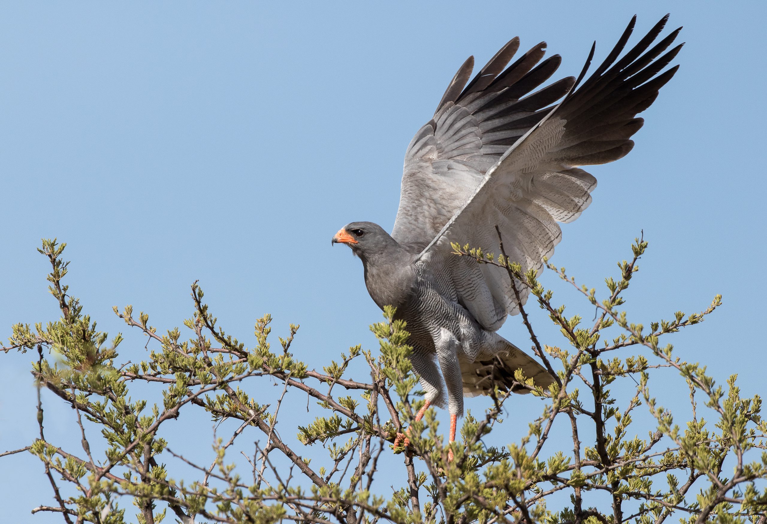 Pale Chanting Goshawks are striking raptors found across open savannah and semi-arid regions of southern Africa. They are highly effective hunters, feeding on insects, small mammals, and reptiles, and play an important role in controlling these prey populations naturally. These raptors are known for their distinctive pale plumage and melodious calls, often seen perched on roadside posts or low shrubs, scanning for prey. They nest in trees or shrubs and are highly territorial during the breeding season.